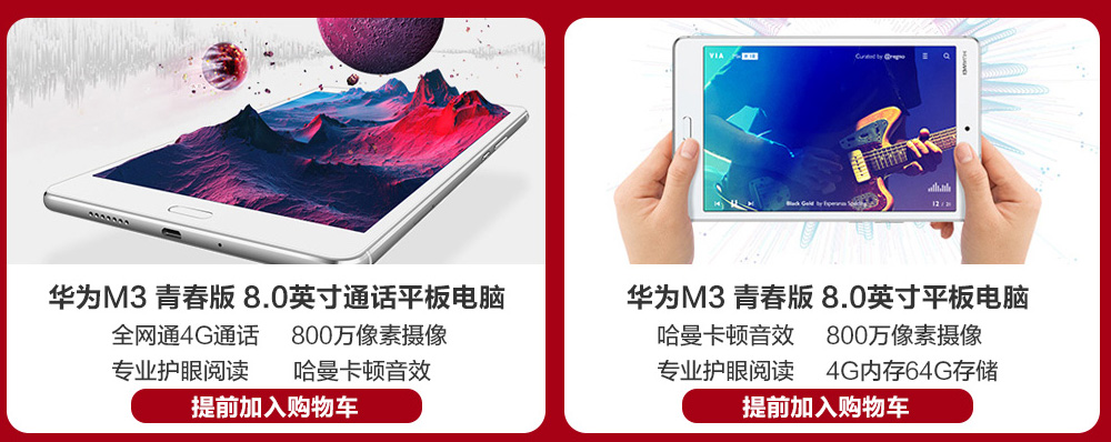 华为(HUAWEI)M3 8.4英寸通话平板电脑(4G 64G 麒麟950 2K高清屏 哈曼卡顿音效 LTE 日晖金)